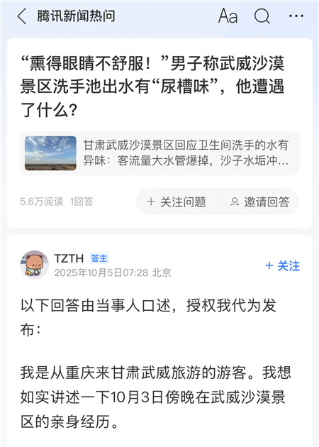 10月3日,有网友反映,甘肃武威沙漠景区,在景区卫生间洗手,“第一下出空气,第二下之后都是出有黄又泛白沫的水,洗完手上一股子油烟子和尿的臭味”,这名网友质疑,“出来的是未经过滤的尿水?”。在社交平台也有不少网友反映,武威沙漠景区卫生间洗手的水有异味。