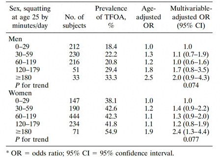 [1] zhang, y., hunter, d. j., nevitt, m. c., xu, l., niu, j., lui, l.-y., yu, w., aliabadi, p., & felson, d. t. (2004). association of squatting with increased prevalence of radiographic tibiofemoral knee osteoarthritis: the beijing osteoarthritis study. arthritis & rheumatism, 50(4), 1187–1192.