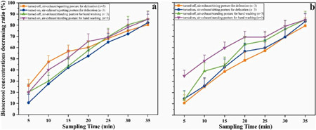 2022年,中国地质大学(武汉)瓦吉德•阿里等学者通过对比试验发现,无论是否打开排风设施,蹲便器卫生间生物气溶胶浓度始终高于设置马桶的卫生间0.3—0.6倍。在排风关闭条件下,蹲便器排便姿势的初始浓度高达1571.26±15.45cfu/m³,而马桶仅为989.40±8.82cfu/m³;在排风开启条件下,蹲便器浓度仍有890.46±7.13cfu/m³,明显高于马桶的715.90±4.73cfu/m³。