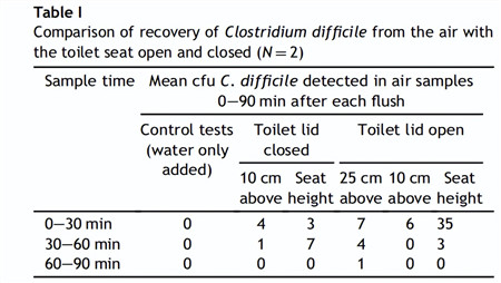 另外,马桶盖也是遮挡气溶胶的重要法宝。2012年,英国利兹大学医学院微生物学系教授马克•h•威尔科克斯等通过在马桶上方三个不同高度(马桶座高度、马桶座上方10厘米和25厘米)采集空气样本,评估艰难梭菌在冲水过程中的气溶胶化情况。结果显示,在马桶盖关闭的情况下,空气样本中未检测到以气溶胶形式传播的艰难梭菌。
