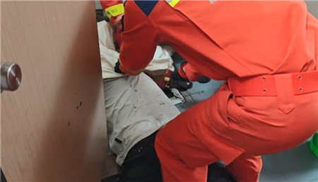 湖北天门,一男子洗澡时脚下一滑,他立即下意识用手支撑,结果整个右手臂卡进了便池管道。消防员到场后破拆便池救人。