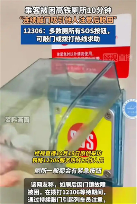 10月19日,经视直播记者就此咨询铁路12306服务热线。工作人员回应称,多数高铁车厢的厕所内设有sos紧急呼叫按钮,若遇到门无法打开或其他异常情况,可尝试使用该按钮求助。“具体设置以实际车型标注为准,但大部分车厢都配备有此装置。”工作人员补充说,乘客也可通过敲门呼救引起外面乘客、路过列车员注意,或拨打12306反馈问题。对于设备维护问题,其表示,铁路部门会定期对设施进行检修保养,若发生故障需现场具体排查。