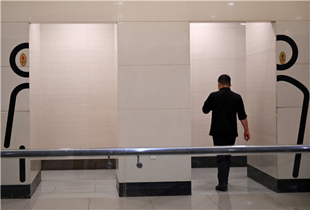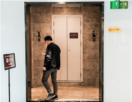 10月19日,在重庆市两江新区一商场,顾客如厕前观察卫生间标识。