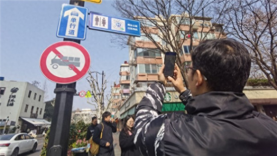 刘佳悦扫描路杆上的二维码。陈玺撼/摄