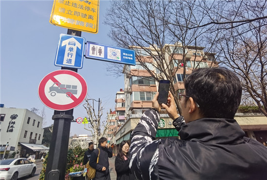大年初二上午,武康大楼附近也出现了“怪人”——把手机举高,扫描路杆上的二维码,然后过马路,再扫一个,直到把周围9个都扫完。