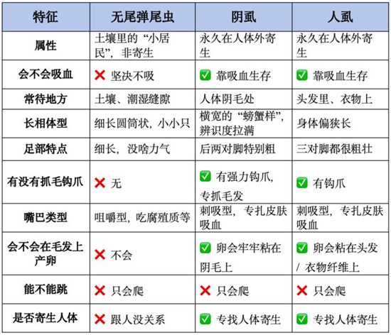 虽然无尾弹尾虫没危害,但阴虱、人虱可是会寄生人体、带来不适的“真麻烦”,光看小虫子很容易懵,一张表帮你彻底分清,再也不认错: